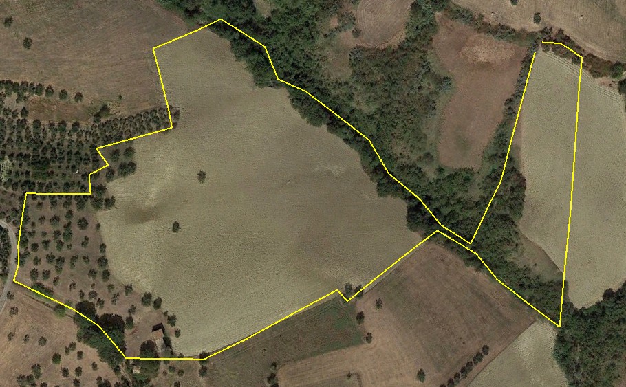 con terreno in pendenza, con esposizione prevalentemente nord-est, diviso in due corpi, coltivato a uliveto con 65 piante secolari e a seminativo con 50 piante di quercia